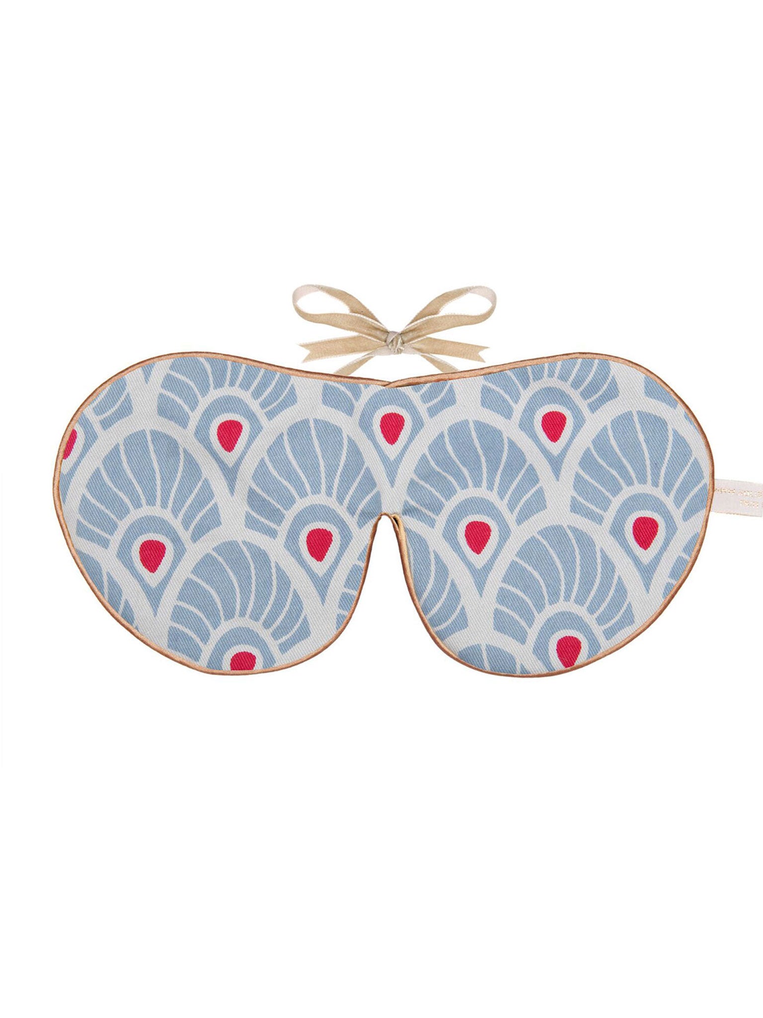 The mask is oversized with Feather Design in Forget Me Knot on the front and plain velvet on the back. Velvet ties to adjust for the perfect fit, so the mask rests gently on your cheeks and forehead, completely blocking out all light.